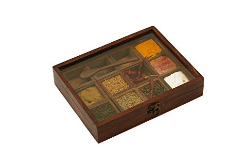 Freakway Sheesham Decorative Multipurpose Wooden Boxes/Masala Dabba Containers Jars & Wooden Masala Box with 12 cotainer for Kitchen with Spoon