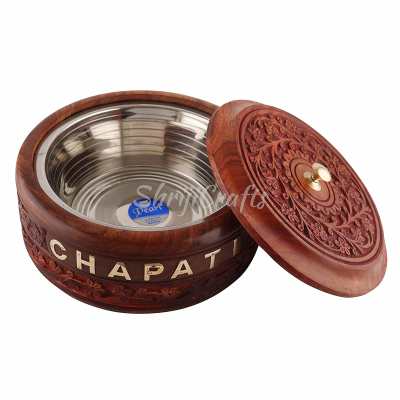 Ortus Round Shape Seasoned Sheesham Wood/Rosewood with Brass knob and Stainless Steel Engraved Casserole Chapati Box for Kitchen and Dining Table Ideal for Gifting (9 inches) Free 2 Spoons