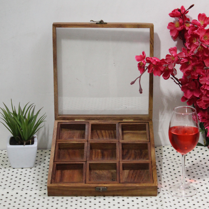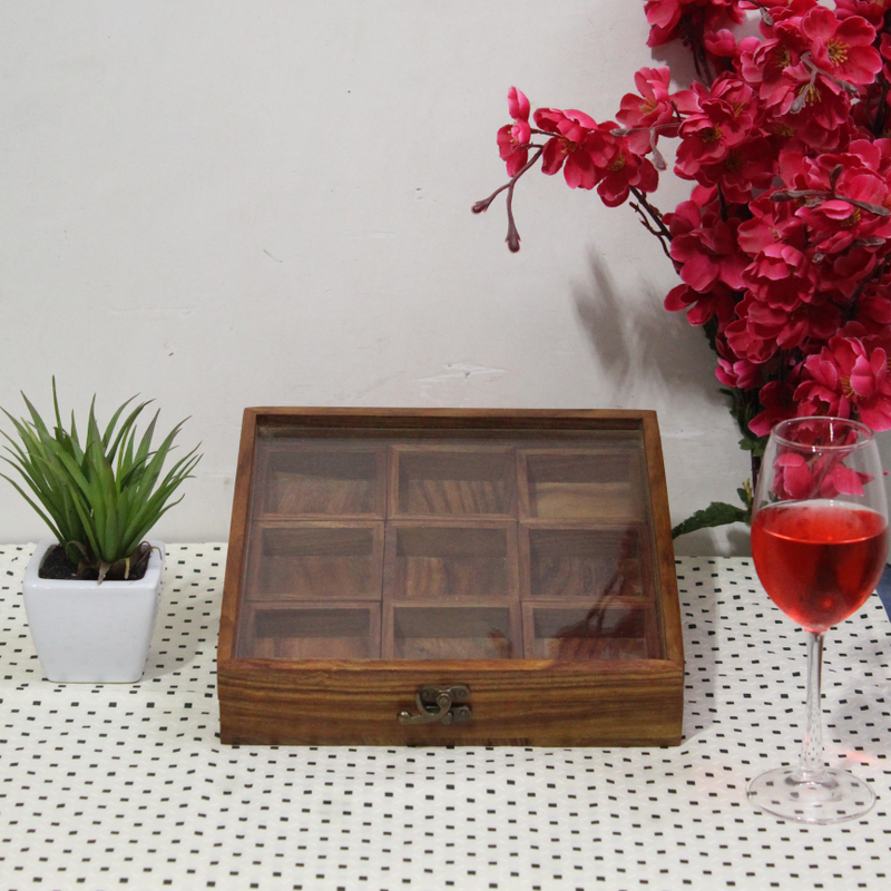 Keep your masala organised for ease of cooking at kitchen, the wooden Sheesham spice box for kitchen spices with excellent quality. This comprises of nine sections to keep different spices.This comes with a free Sheesham wood spoon to make things easy. This beautiful box is specially design for kitchen in order to organise the things easily. This box has great durability of 10yrs minimum.This wooden box organiser is best suitable for keeping spice easily. It comes with a safety lock. Lid of the box is not glass, in order to increase its durability we have replaced it with Malaysian fibre, which has excellent quality and shock proof. Also we have provided a free spoon in order to make things easy.